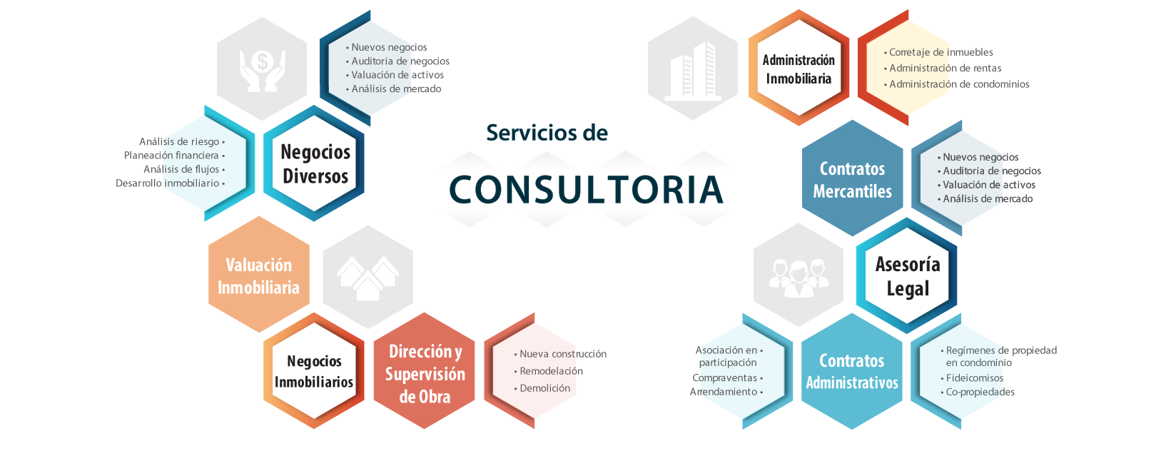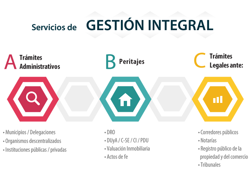 Ofrecemos servicios de proyección, análisis y auditoria de negocio, inversiones, riesgo y rentabilidad; diseño de estrategias financieras, legales, fiscales, técnico-constructivas, tecnológicas y de comunicación; gestión de todo tipo de trámites y ante todas las dependencias; peritajes; administración inmobiliaria; gestión Inmobiliaria; así como dirección y supervisión de obra.